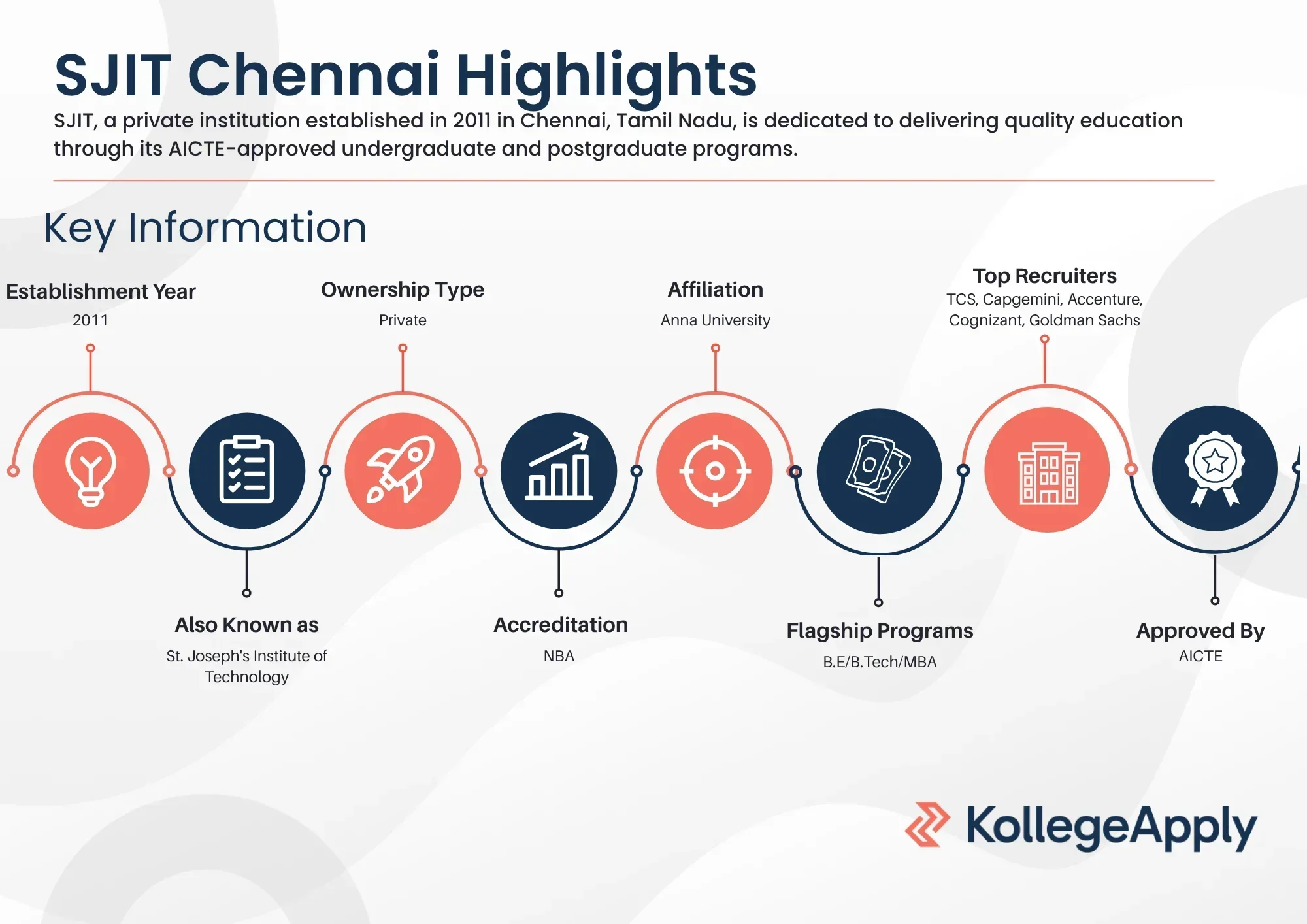 St. Joseph's Institute of Technology (SJIT), a private institution established in 2011 in Chennai, Tamil Nadu, affiliated with Anna University is dedicated to delivering quality education through its AICTE-approved undergraduate and postgraduate programs. Accredited by NBA. Offering nine courses across disciplines such as Computer Science Engineering, Cyber Security, Electrical, Electronics and Communication, Information Technology, and Mechanical Engineering, SJIT accommodates over 1,100 students. The institute also provides MBA and PGDM programs under Business and Management Studies. With a strong emphasis on academic excellence, industry relevance, and holistic development, SJIT aims to nurture skilled professionals equipped for success in the ever-evolving global landscape.