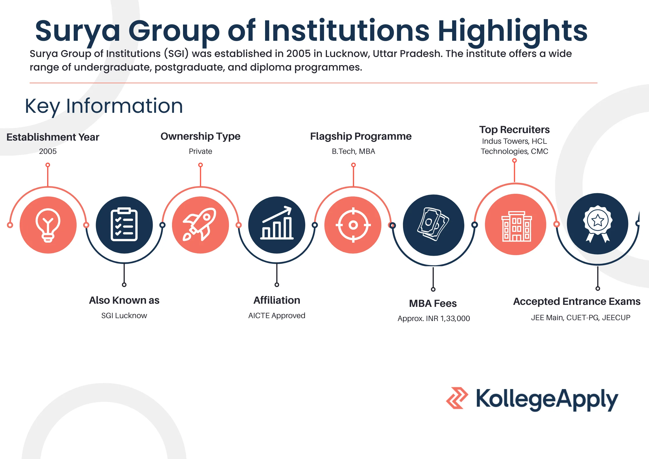 Surya Group of Institutions (SGI) was established in 2005 in Lucknow, Uttar Pradesh. The institute offers a wide range of undergraduate, postgraduate, and diploma programmes across disciplines, such as Engineering, Management, and Computer Applications. Flagship courses include B.Tech and MBA. The courses are approved by the AICTE.