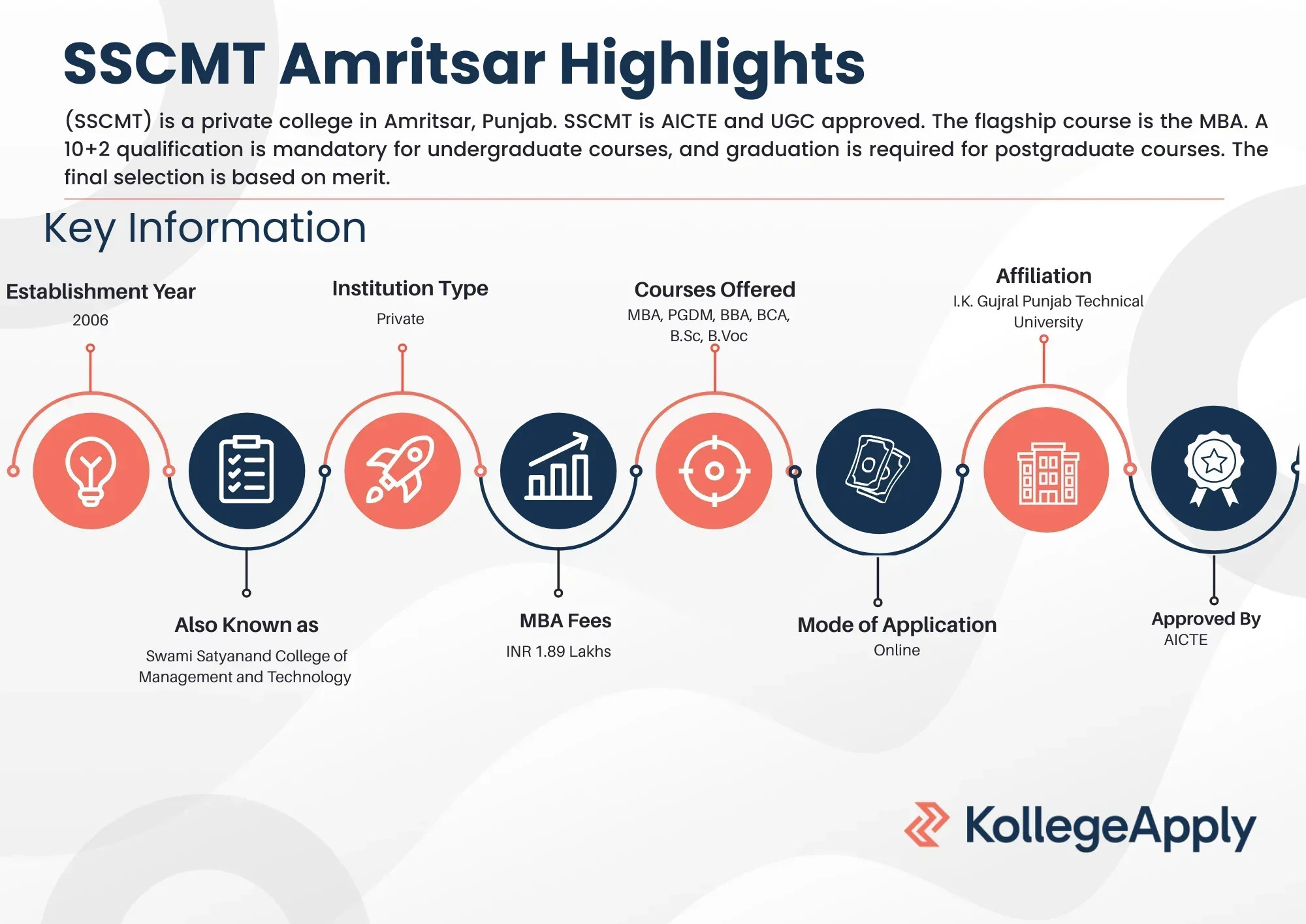 Swami Satyanand College of Management and Technology (SSCMT) is a private college in Amritsar, Punjab. SSCMT is AICTE and UGC approved, and I.K. Gujral Punjab Technical University (IKGPTU) affiliated. SSCMT offers various undergraduate and postgraduate courses such as MBA, PGDM, BBA, BCA, B.Sc (Biotechnology), BHMCT, B.Voc, BTTM, M.Com, and M.Sc (Biotechnology). The flagship course is the MBA and has a fee of INR 1.89 lakhs. A 10+2 qualification is mandatory for undergraduate courses, and graduation is required for postgraduate courses. The final selection is based on merit.