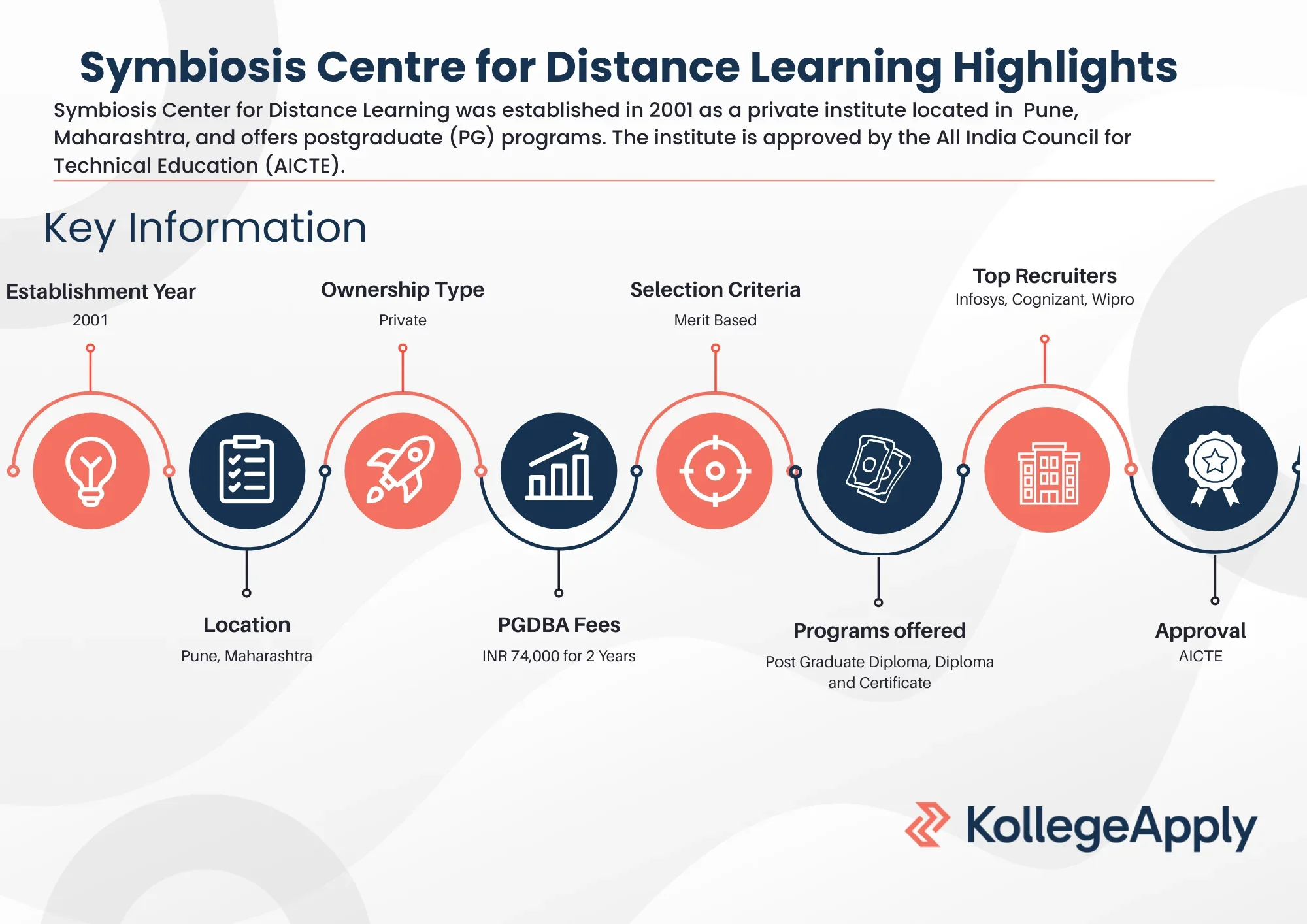 Additionally, Symbiosis Centre for Distance Learning has maintained a strong placement record, with top recruiters including Wipro, Aditya Birla Group, IBM, Deloitte, Cognizant Technology Solutions, HP, Convergys, TATA AIA, Mphasis, Finolex, Garrett Motion and Vodafone.