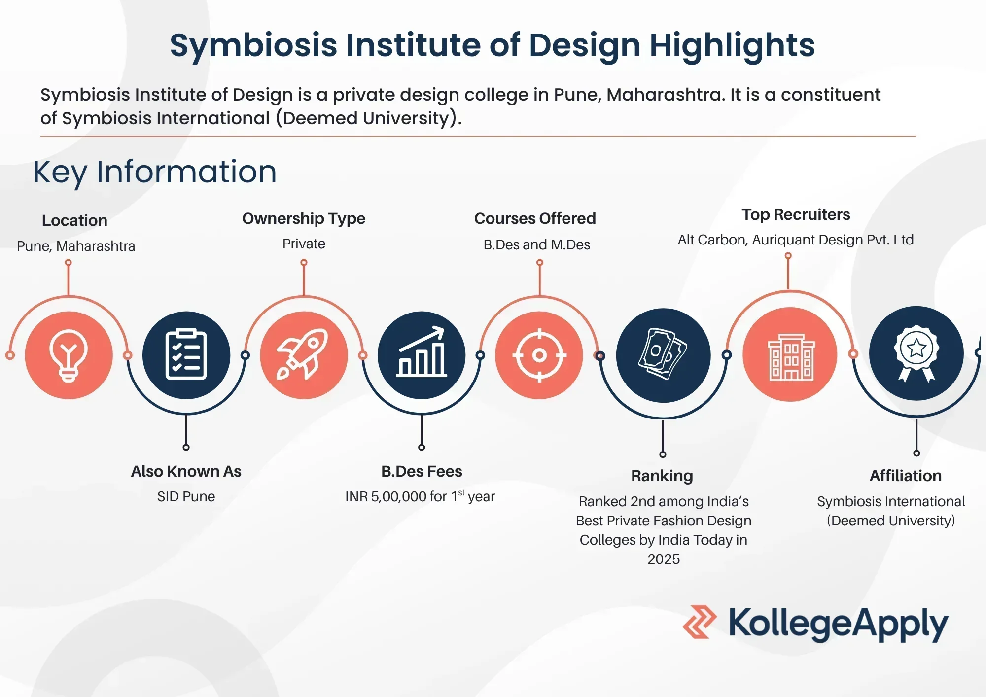 Symbiosis Institute of Design is a premier design institute in Pune, Maharashtra. It is a constituent of Symbiosis International (Deemed University), which is recognized by UGC. The institute is ranked 2nd among India’s Best Private Fashion Design Colleges by India Today in 2025. It offers a 4-year Bachelor of Design (B.Des) and a 2-year Master of Design (M.Des).