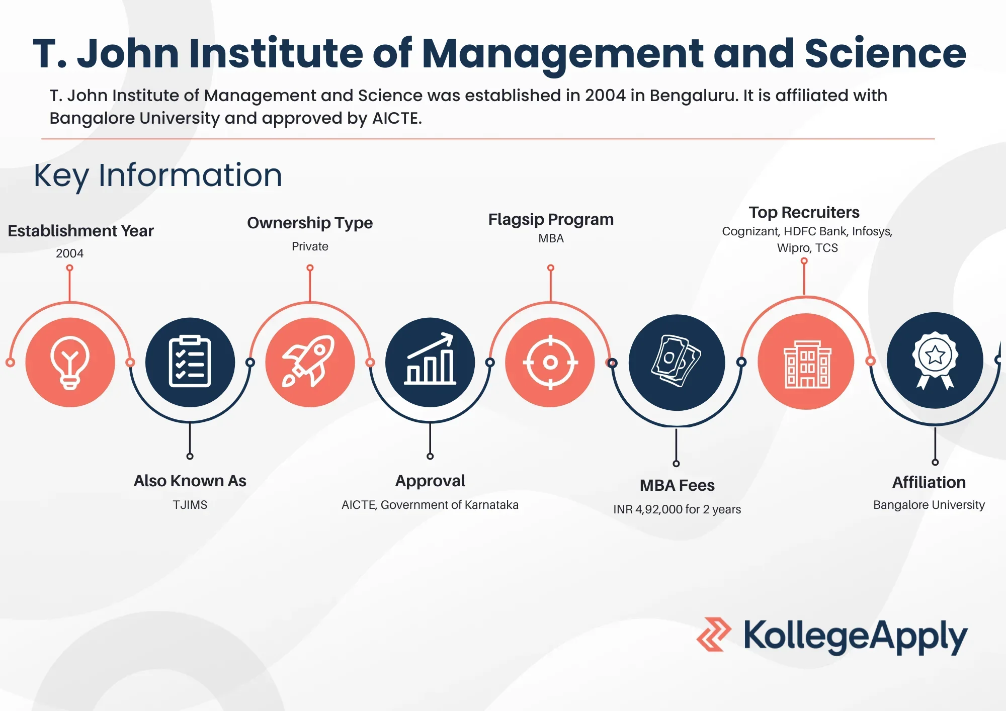 The T. John Institute of Management and Science fees for the two-year flagship MBA course is INR 4,92,000. For admission to the MBA course, a bachelor's degree with a minimum of 50% marks (45% for SC/ST/OBC candidates of Karnataka) is required. T. John Institute of Management and Science Admission 2025 is based on entrance exams, such as Karnataka PGCET, MAT, CAT or KMAT.