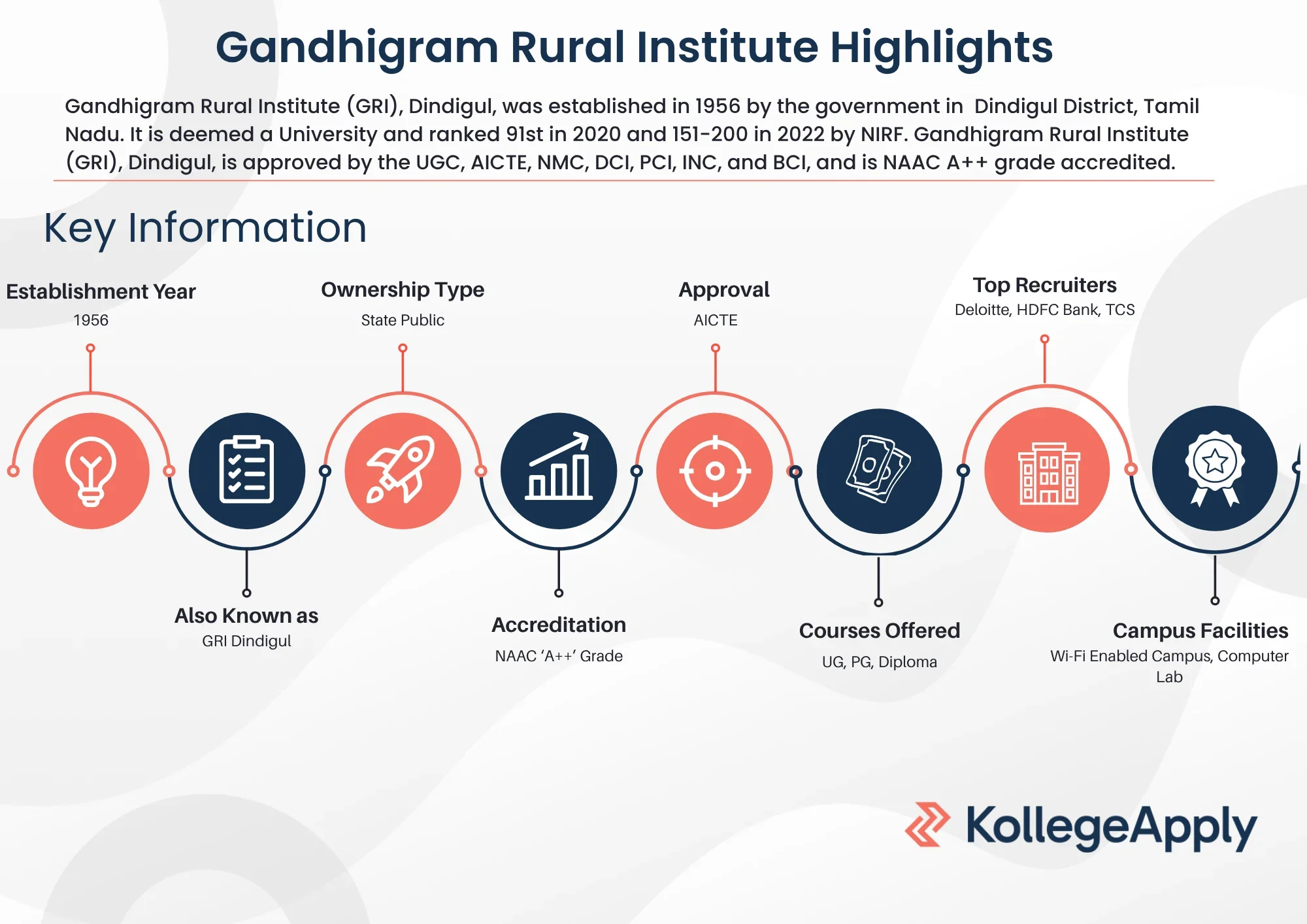 Gandhigram Rural Institute (GRI), Dindigul, was established in 1956 by the government in Dindigul District, Tamil Nadu. It is deemed a University and ranked 91st in 2020 and 151-200 in 2022 by NIRF. Gandhigram Rural Institute (GRI), Dindigul, is approved by the UGC, AICTE, NMC, DCI, PCI, INC, and BCI, and is NAAC A++ grade accredited. Admission to Gandhigram Rural Institute (GRI) Dindigul is based on entrance examinations, depending on the course. Gandhigram Rural Institute (GRI) Dindigul also offers skill-based programs in B.Voc./ D.Voc./ Diploma / Certificate.