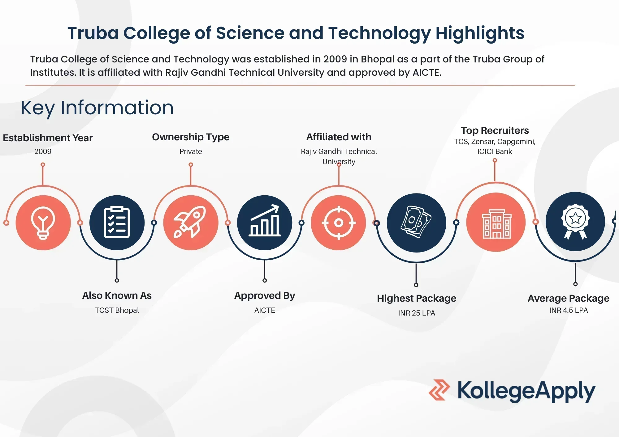 The official has not officially released the 2025 placement report. Truba College of Science and Technology offers a wide range of opportunities to its students to get placed because of its alumni network and ties with some great companies like TCS, Zensar, Capgemini, ICICI Bank, Axis Bank, HDFC Bank, BYJU’S, and Tech Mahindra. The highest package offered till date is INR 25 lakh/annum, and the average package is INR 4.5 lakh/annum, taking the average placement rate to 93%.