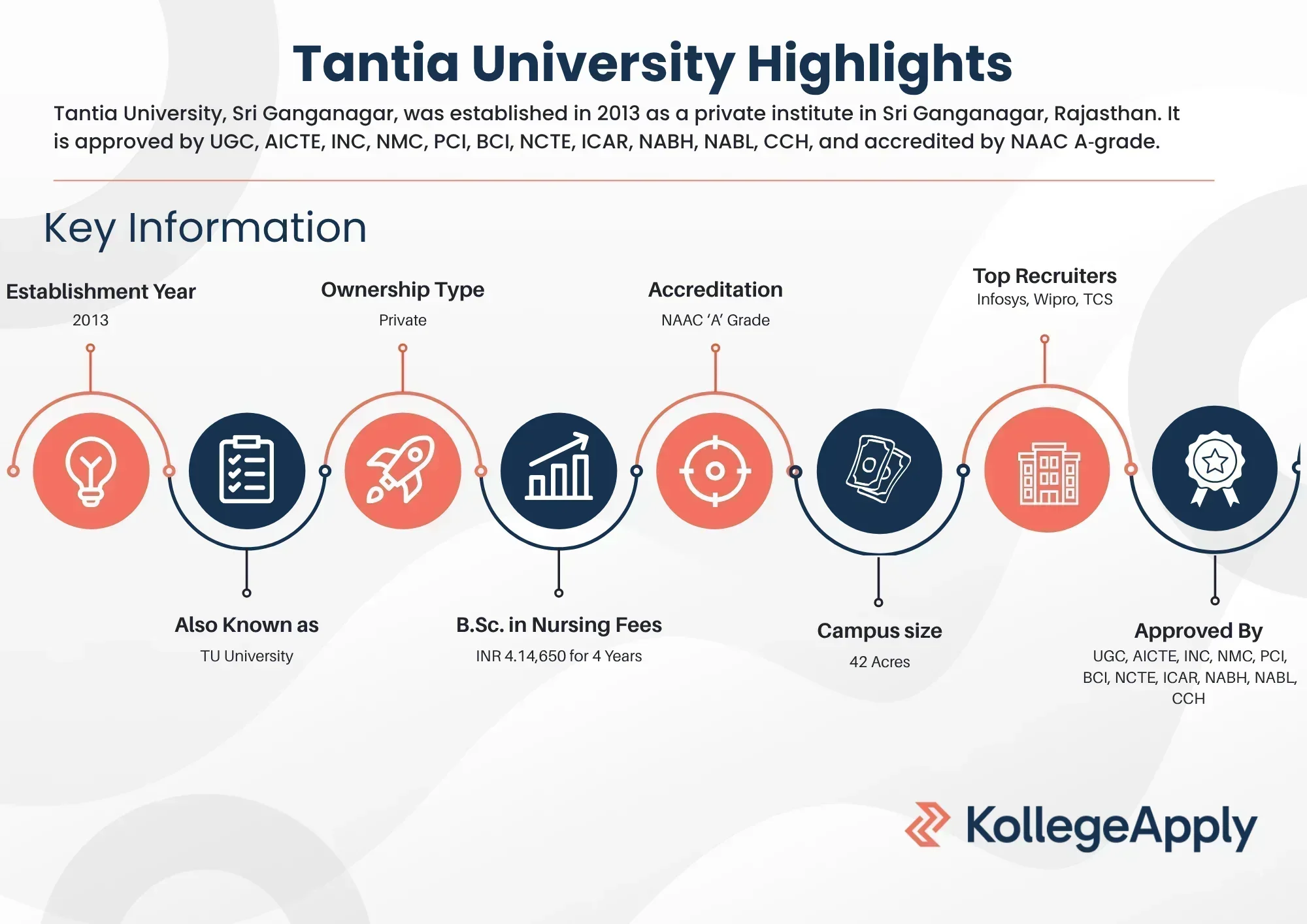 Tantia University, Sri Ganganagar, was established in 2013 as a private institute in Sri Ganganagar, Rajasthan, in an area of 42 acres. Tantia University, Sri Ganganagar, was approved by UGC, AICTE, INC, NMC, PCI, BCI, NCTE, ICAR, NABH, NABL, CCH, affiliated with UGC, and accredited by NAAC A‑grade. Tantia University, Sri Ganganagar, offers 85+ courses in diploma, UG, PG, and Ph.D to its students based on merit/entrance, depending on the course. The candidate meeting the minimum eligibility criteria can apply for their respective course.