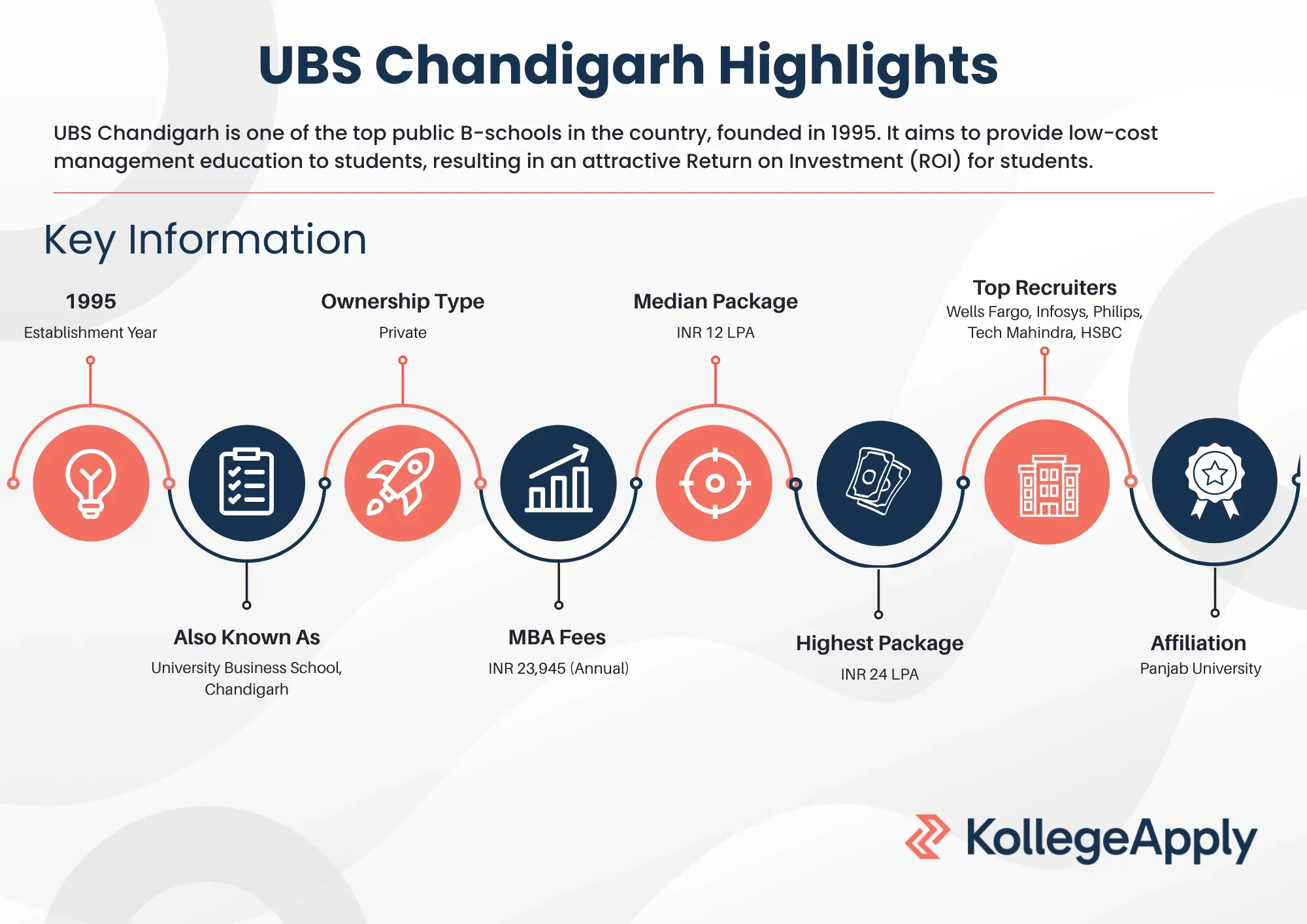 UBS Chandigarh has a good placement record, with an average package of INR 12.43 LPA and the highest package going up to INR 24 LPA in 2024. The campus witnessed major companies recruiting students from the college, such as Wells Fargo, KPMG, Tech Mahindra, HSBC, Infosys, Aditya Birla Group, Philips, etc. The field of recruiter companies revolves around finance, consulting, marketing, analytics, etc.