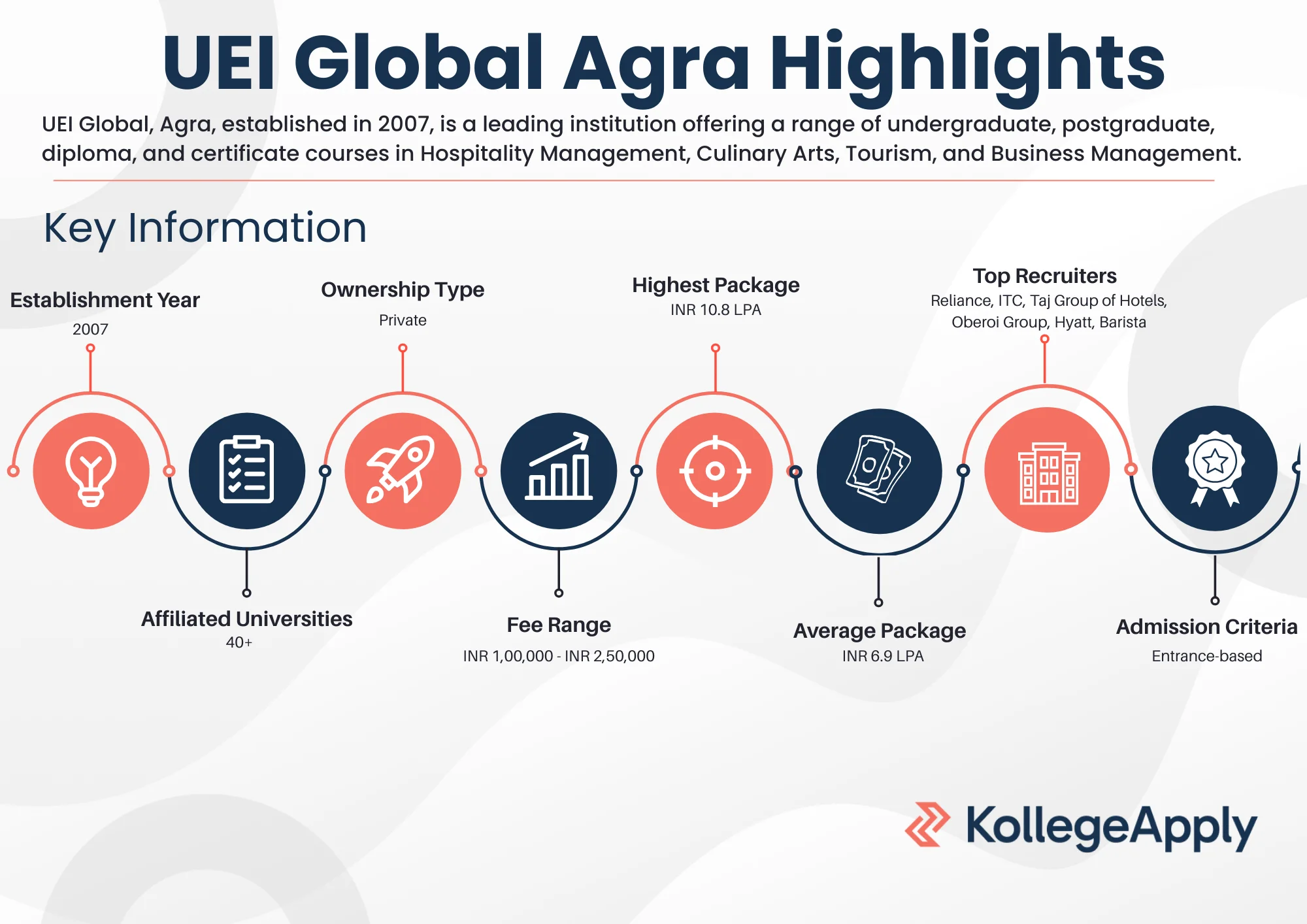 UEI Global, Agra offers various undergraduate, postgraduate, diploma, and certificate courses in Hospitality Management, Culinary Arts, Tourism, and Business Administration. Below is the institution's list of courses, eligibility criteria, and selection process.