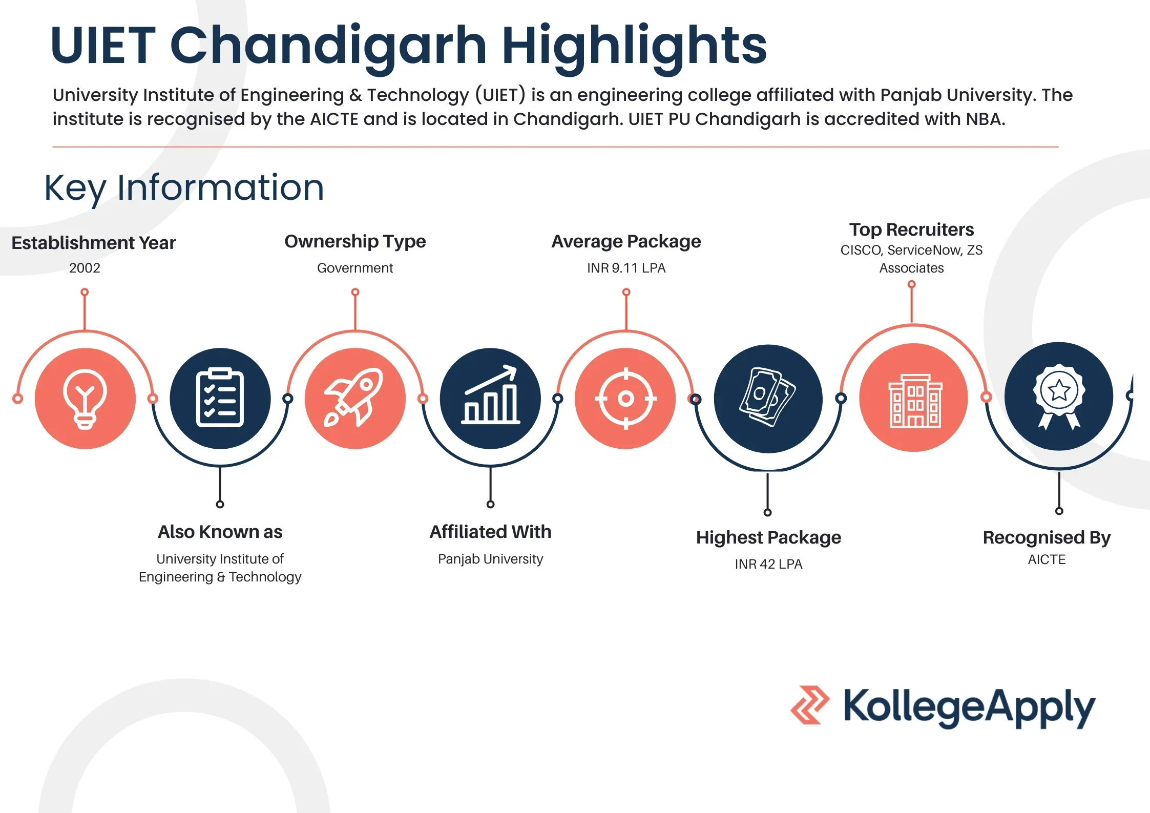 University Institute of Engineering & Technology Panjab University Chandigarh offers scholarships to meritorious students. UIET Chandigarh admission is based on merit and entrance exams. The university accepts national entrance exams such as JEE Main, GATE, and others. The university has been ranked among the top 25 engineering universities in India by NIRF 2023. During UIET placements 2024, the highest and average packages stood at INR 42 LPA and INR 9.11 LPA, respectively.