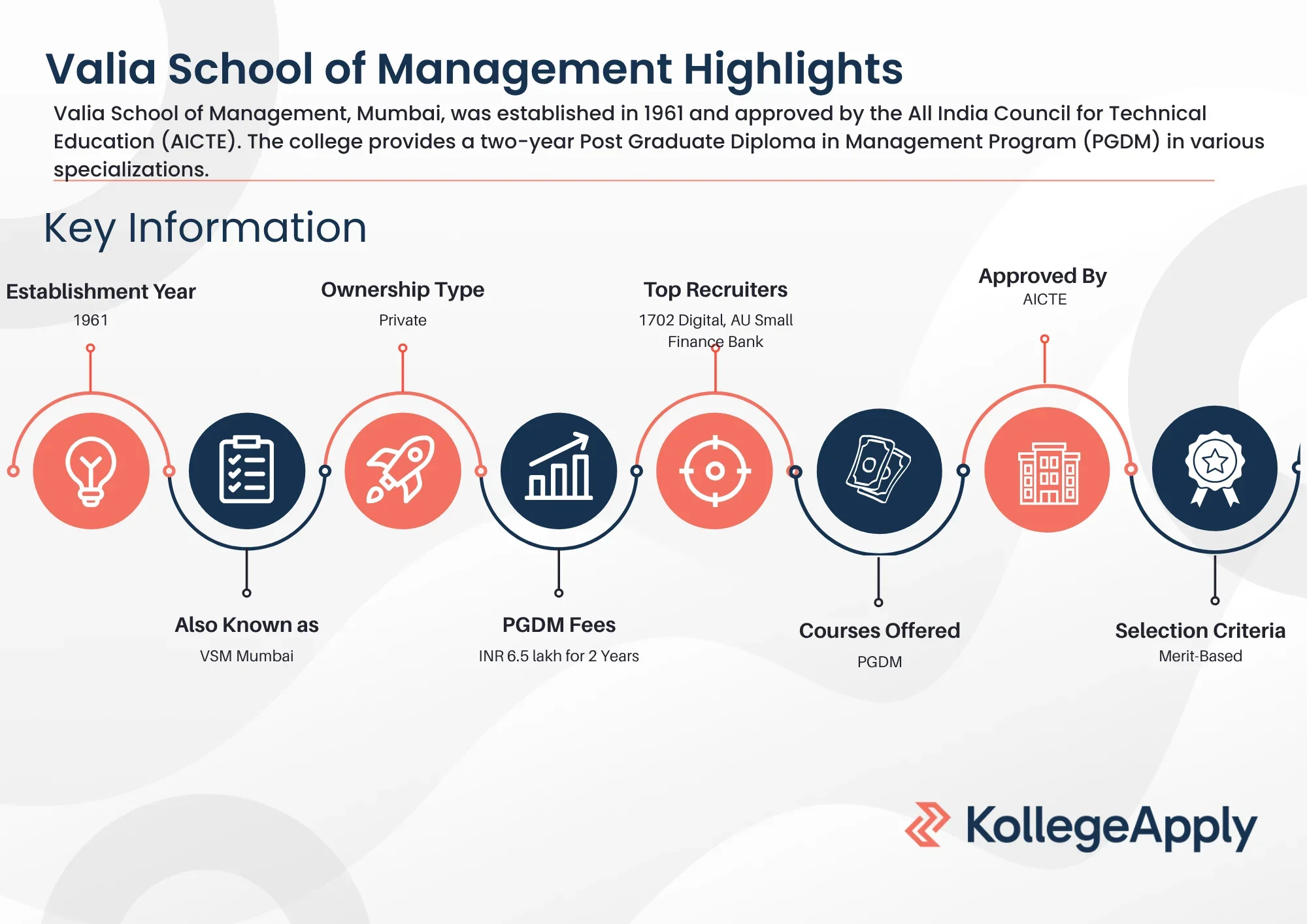 Valia School of Management, Mumbai, was established in 1961 and approved by the All India Council for Technical Education (AICTE). The college provides a two-year Post Graduate Diploma in Management Program (PGDM) in various specializations. VSM has received the highest stipend offer of INR 35,000 per month in 2024 and an average stipend offer of INR 15,000 per month. The top companies that have participated in the placement drive are 1702 Digital, AU Small Finance Bank, Axis Bank, Blue Star, Cargosol, Cielo Systems, IIFL Securities, and more. Furthermore, the institute provides multiple facilities, such as well-equipped classrooms, digital classrooms, an air-conditioned campus, a library, a canteen & cafeteria, sports facilities, hostels, an auditorium, and more.