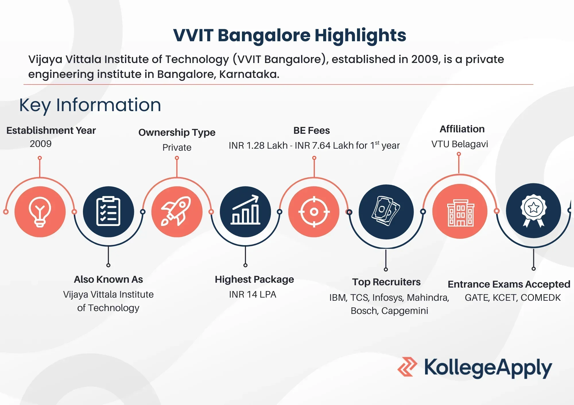 VVIT Bangalore offers Diploma, BE and M.Tech courses in various specializations. Admission to these courses is based on merit. The institute also accepts entrance exams like GATE, KCET and COMEDK.