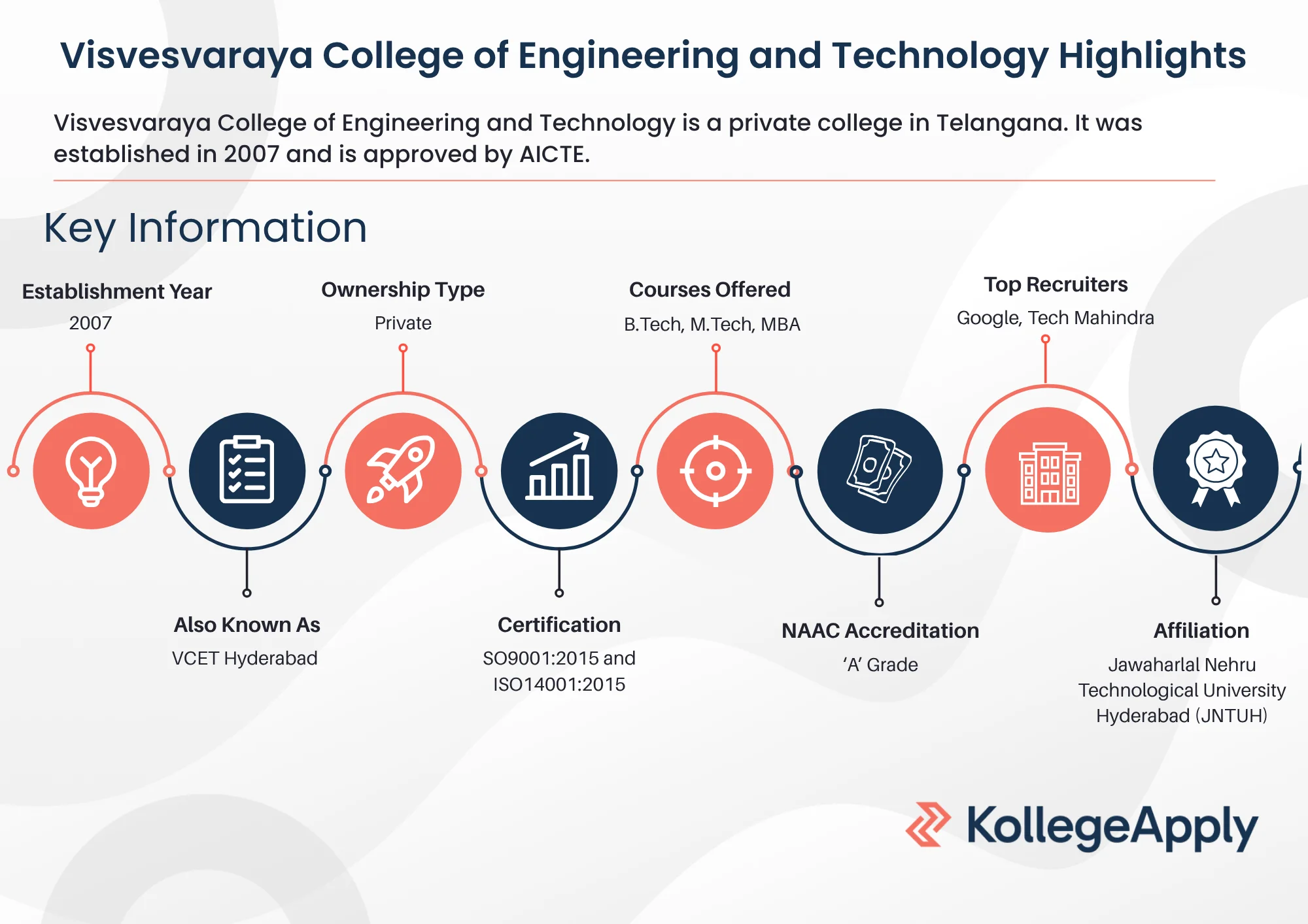 Visvesvaraya College of Engineering and Technology is a private engineering college in Ibrahimpatnam, Telangana. The college has UGC autonomous status and is approved by AICTE and is affiliated to Jawaharlal Nehru Technological University, Hyderabad (JNTUH). The college is accredited with an ‘A’ grade by NAAC. It is also an ISO9001:2015 and ISO14001:2015 certified institution. Courses offered here include B.Tech, M.Tech and MBA.