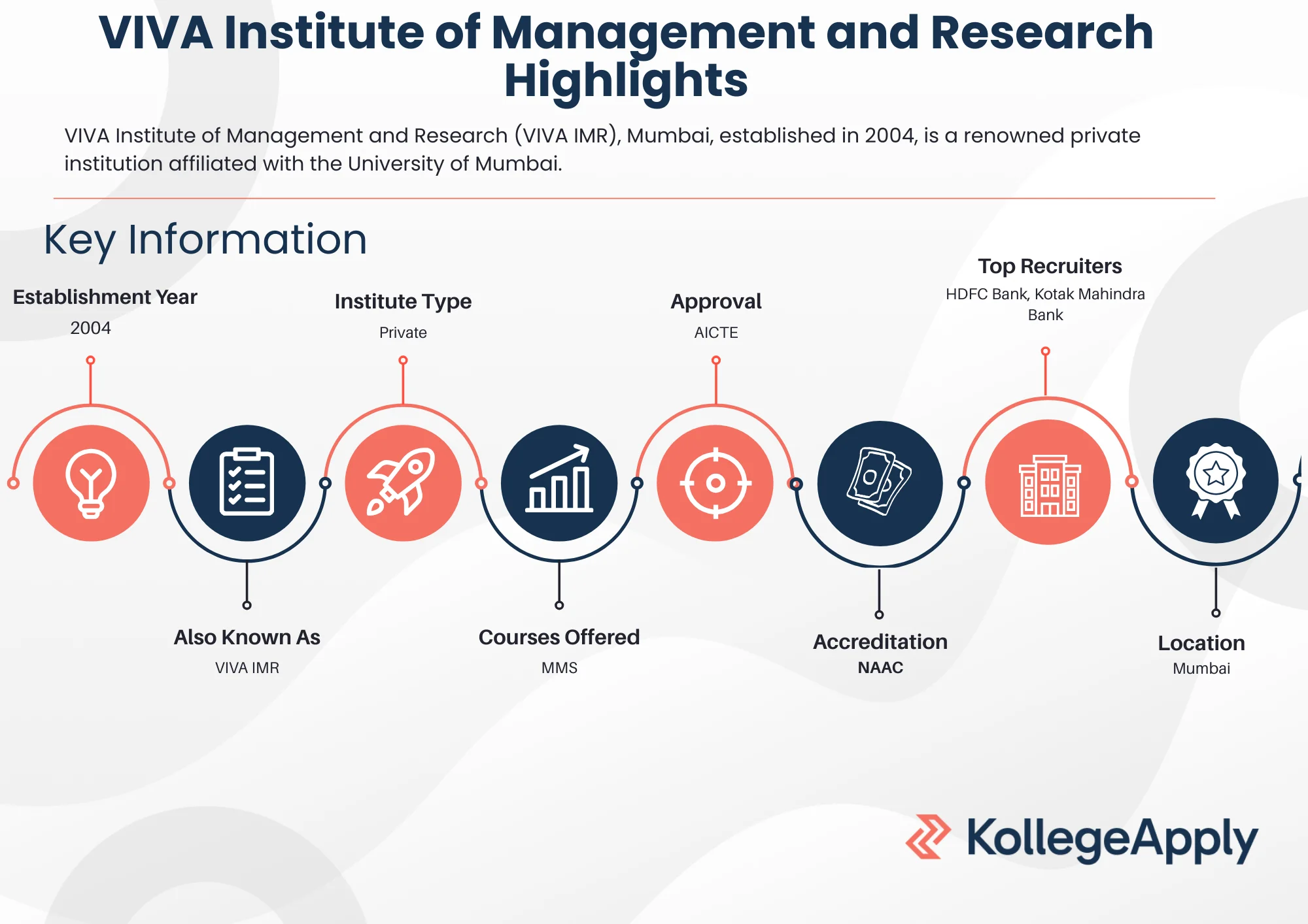 VIVA Institute of Management and Research admissions are based on MAH-MBA/MMS-CET or equivalent national-level entrance exams like CAT, CMAT, XAT, GMAT, MAT, and ATMA. The VIVA Institute of Management and Research fees for the MMS program are INR 92,500 per year. Additionally, VIVA IMR boasts a strong placement record, with top recruiters such as HDFC Bank, Kotak Mahindra Bank, and Capgemini offering lucrative career opportunities to VIVA IMR graduates.