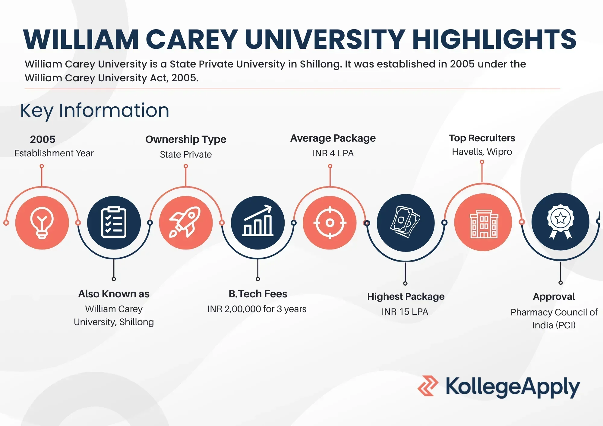 William Carey University in Shillong, Meghalaya, is a State Private University established under the William Carey University Act, 2005. It is recognised by the University Grants Commission (UGC) and approved by the Pharmacy Council of India (PCI). The university started with just 4 departments and now has 28 departments offering a wide range of Undergraduate, Postgraduate, Diploma, PG Diploma and Research courses.