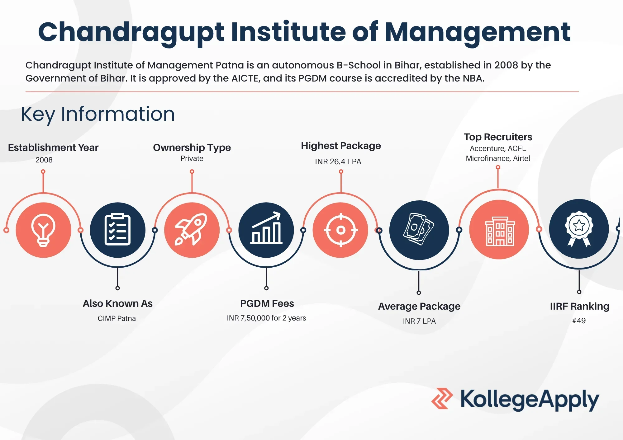 Chandragupt Institute of Management, Patna, has an excellent track record of placements. Some of the top recruiters at the institute include Accenture, ACFL Microfinance, Airtel, Berger Paints, Nestle India Limited, Piramal Group, PlanetSpark, Shoppers Stop, Stock Holding, Ujjivan Small Finance Bank, among others. Most students are placed in the banking sector and offered roles in retail banking. The 2025 CIMP Patna placement report is not available. However, according to 2024, the average salary stood at INR 7 LPA. The highest package offered was INR 26.4 LPA.