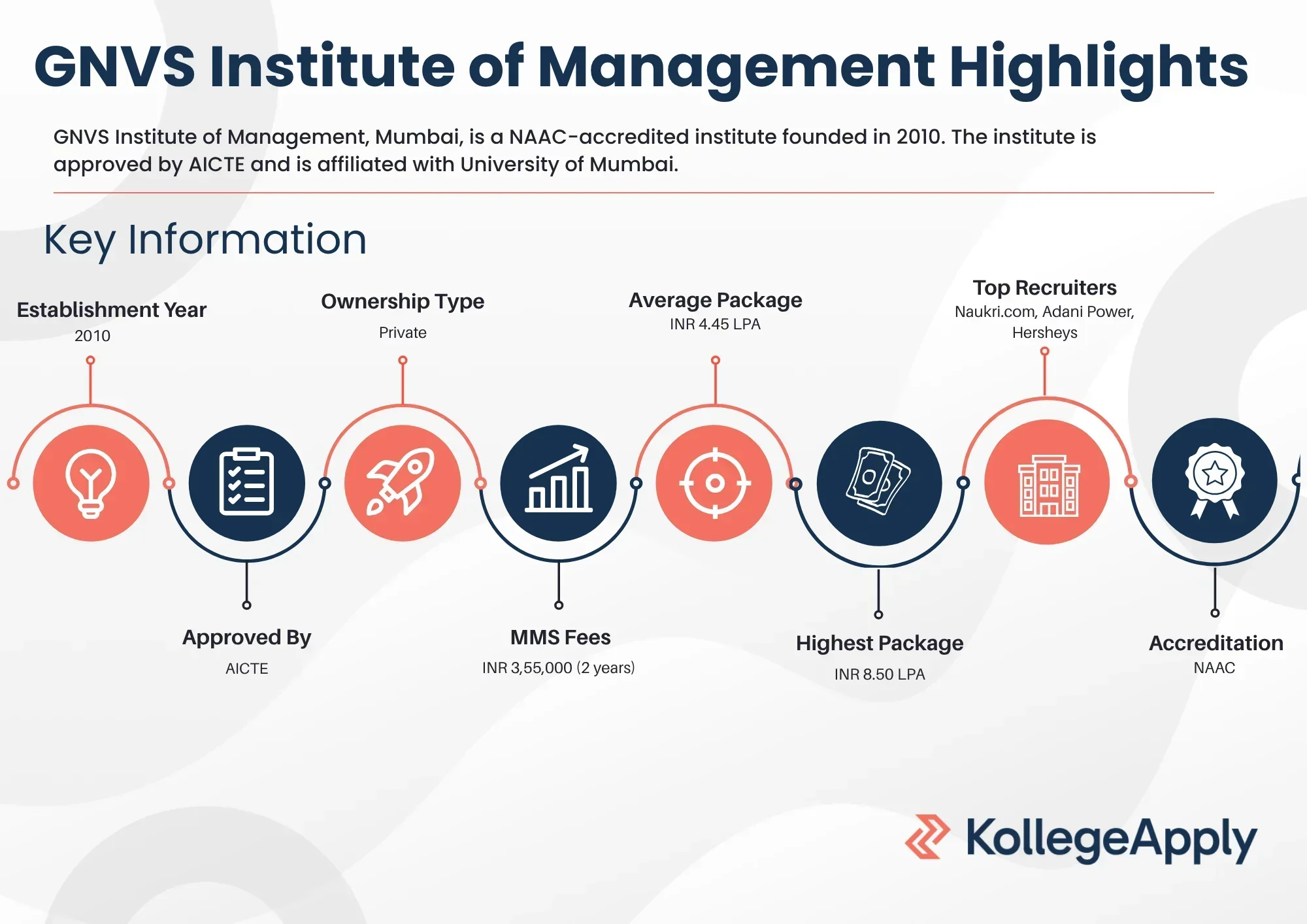GNVS Institute of Management, Mumbai, is a NAAC-accredited institute founded in 2010. The institute is approved by AICTE and is affiliated with University of Mumbai. It offers a 2-year full-time Master of Management Studies (MMS) program. The college was ranked 99th among private B-schools in India by Times B-School Survey in 2024. The institute has a campus size of 1.53 acres and provides all necessary facilities, including air-conditioned classrooms, a hospital and medical facilities, an auditorium, a hostel, and other amenities. The fees for the MMS course is INR 3,55,000 for two years. Furthermore, during the 2024 placement drive at GNVS Institute of Management, the highest package offered was INR 8.50 LPA. Admissions are based on merit and entrance exams, such as CAT, XAT, CMAT, ATMA, MAT and MAH MBA CET, followed by Group Discussion (GD) and Personal Interview (PI).