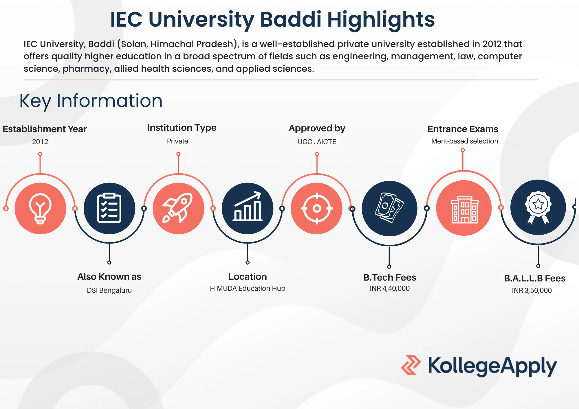 IEC University, Baddi (Solan, Himachal Pradesh), is a well-established private university established in 2012 that offers quality higher education in a broad spectrum of fields such as engineering, management, law, computer science, pharmacy, allied health sciences, and applied sciences. The university is recognized by UGC and has approvals from major regulatory authorities, making its academic courses credible and valuable.