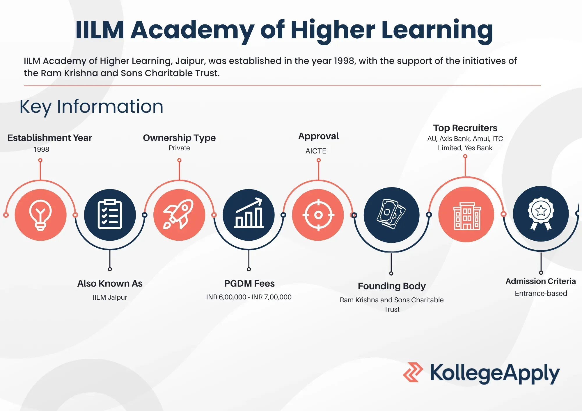 IILM Academy of Higher Learning, Jaipur, was established in the year 1998, with the support of the initiatives of the Ram Krishna and Sons Charitable Trust. It has emerged as a prominent educational centre. The All India Council for Technical Education (AICTE) approves IILM Jaipur. The institution offers a Post Graduate Diploma in Management (PGDM) in five specialisations. Admissions are based on merit and entrance exams, such as CAT, MAT, XAT or CMAT.