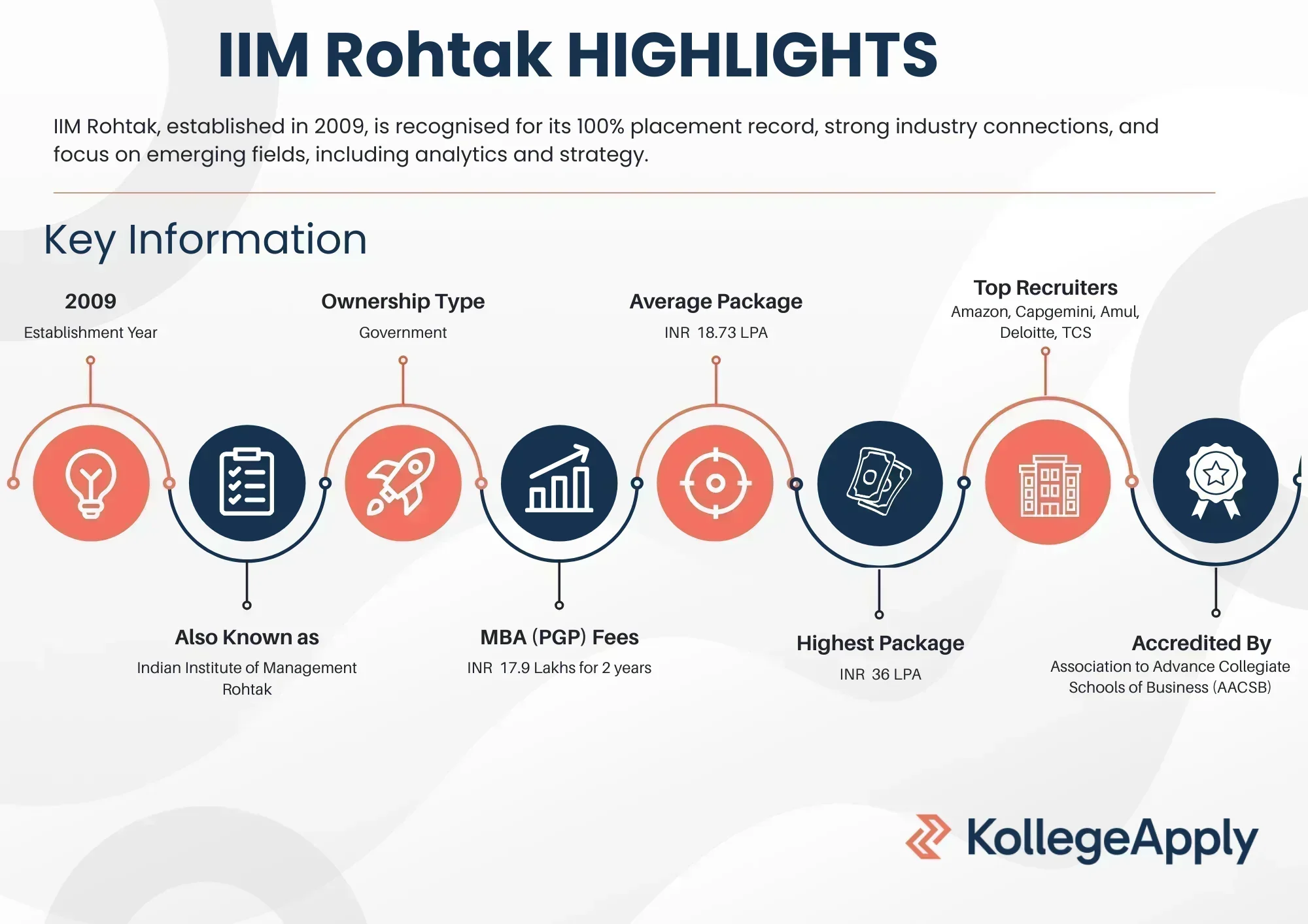The IIM Rohtak Placement 2025 report has been released and the highest package offered was INR 36 LPA. The IIM Rohtak average package stood at INR 18.73 LPA, while the median package was INR 17 LPA for the PGP batch of 2023-25. The highest number of placements was made in the Sales and Marketing Sector during the IIM Rohtak Placement 2025. Some of the top recruiters that participated in the IIM Rohtak Placement 2025 include Amazon, Dell, Cognizant, Barclays, Capgemini, Amul, Decathlon, Emaar, HDFC Bank, ICICI Bank, OYO, TVS, AxisBank, Dell Technologies and Havells.
