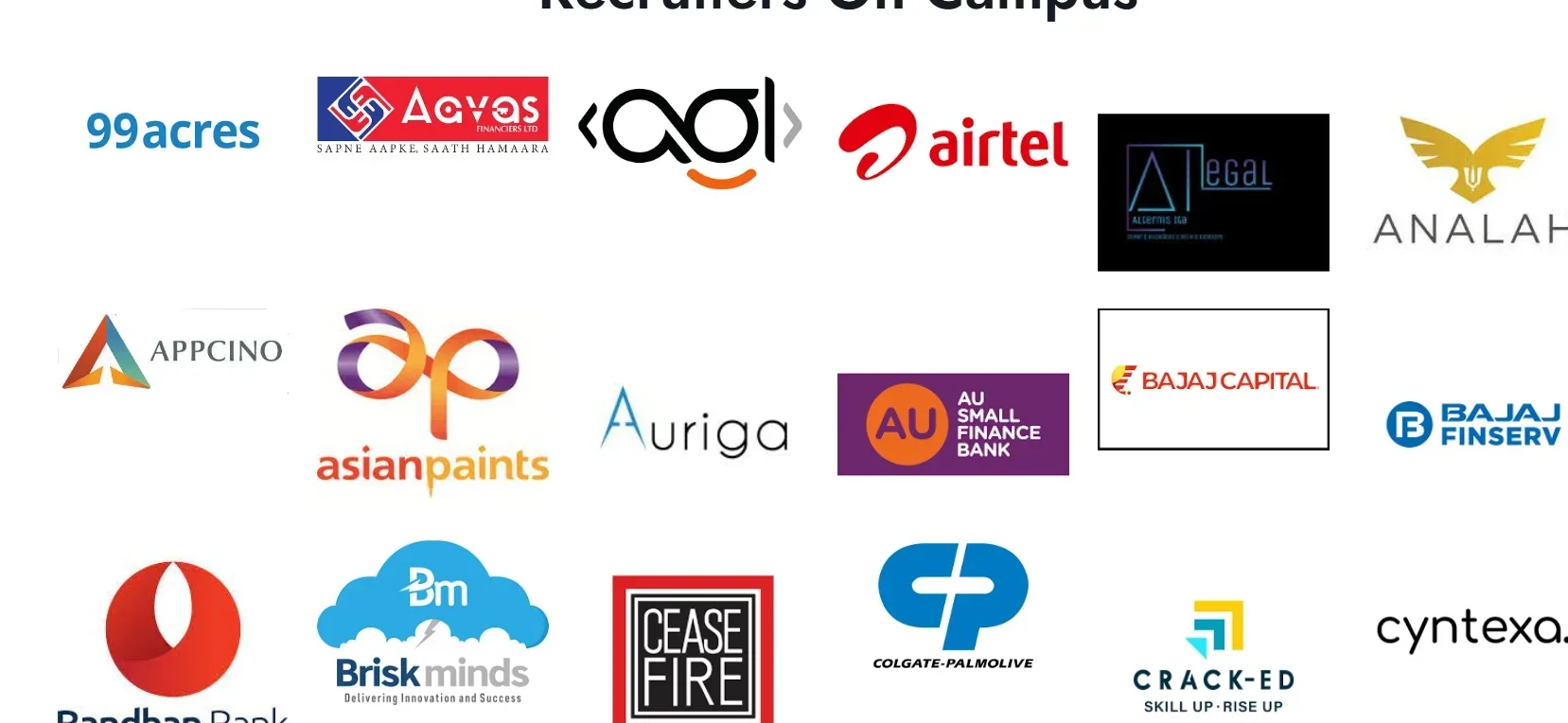 Top Recruiters | ICICI Bank, VIVO, TCS, Capgemini, Kotak Mahindra Bank, Cyntexa, Indiamart, Prodesk, Airtel, 99Acres, Auringa, Asian Paints, Bandhan Bank, AU Bank and many more. |