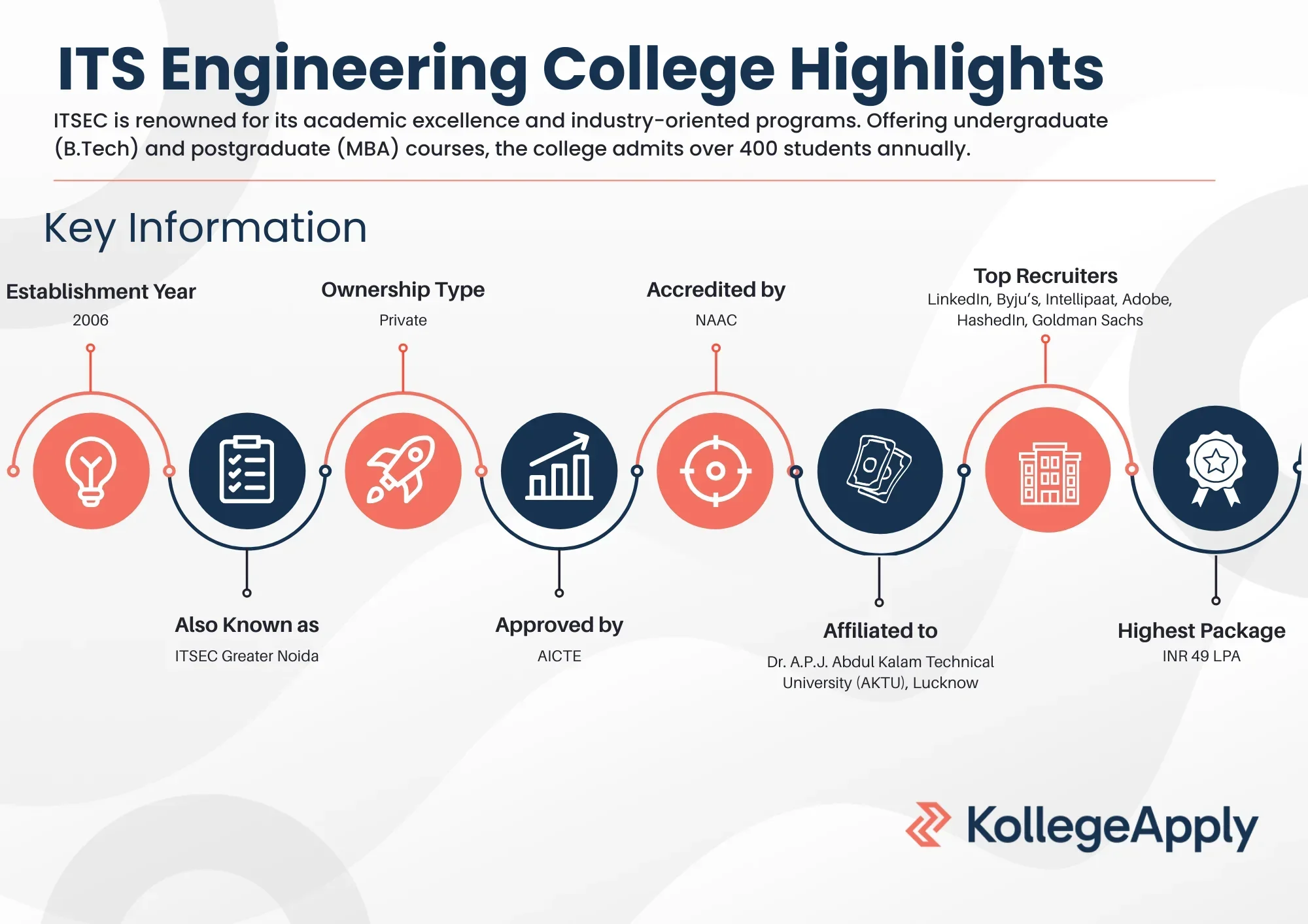 ITS Engineering College (ITSEC), established in 2006, is a leading private institution under the ITS Group of Institutions, located in Greater Noida, Uttar Pradesh. Approved by the All India Council for Technical Education (AICTE) and affiliated with Dr. A.P.J. Abdul Kalam Technical University (AKTU), Lucknow, ITSEC is renowned for its academic excellence and industry-oriented programs. Offering undergraduate (B.Tech) and postgraduate (MBA) courses, the college admits over 400 students annually. With modern infrastructure, experienced faculty, and strong placement records, ITSEC prepares students for successful careers in engineering and management.