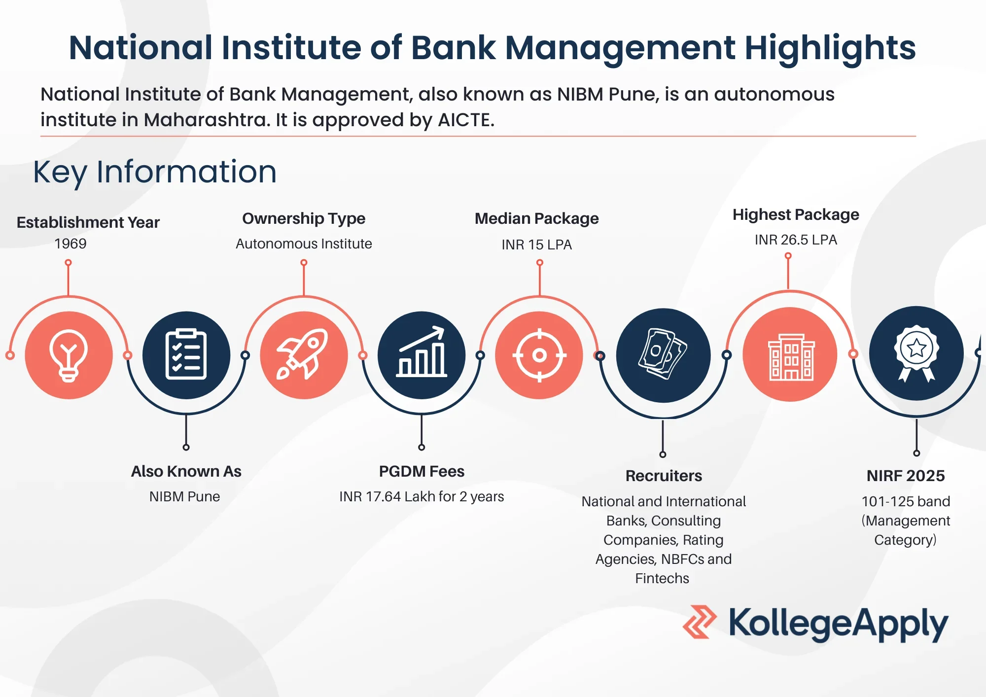 National Institute of Bank Management (NIBM Pune) is an autonomous apex institution located in Maharashtra. It was founded in 1969 by the Reserve Bank of India with support from the Indian government. NIBM Pune was ranked in the 101-125 band (Management category) by NIRF in 2025. The institute is approved by AICTE and offers a Post Graduate Diploma in Management in Banking and Financial Services (PGDM B&FS).