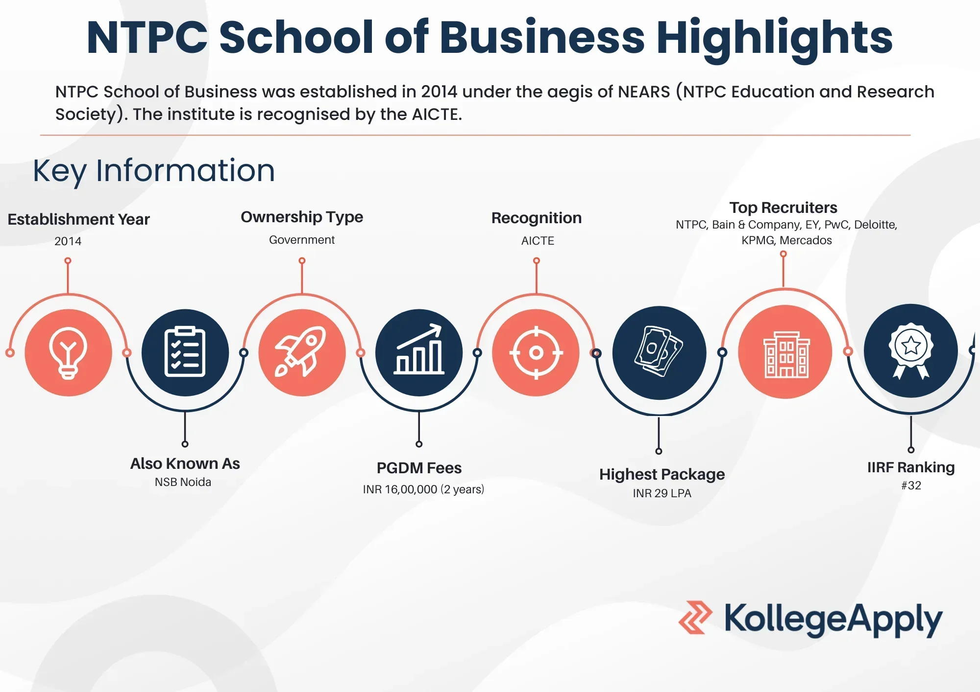 NTPC School of Business offers excellent placement opportunities. The highest package offered during NTPC School of Business placements in 2023 was INR 29 LPA, while the average stood at INR 12 lakh per annum. More than 25 companies participated in the NTPC School of Business placements, with top recruiters including Bain & Company, EY, PwC, Deloitte, KPMG and Mercados.