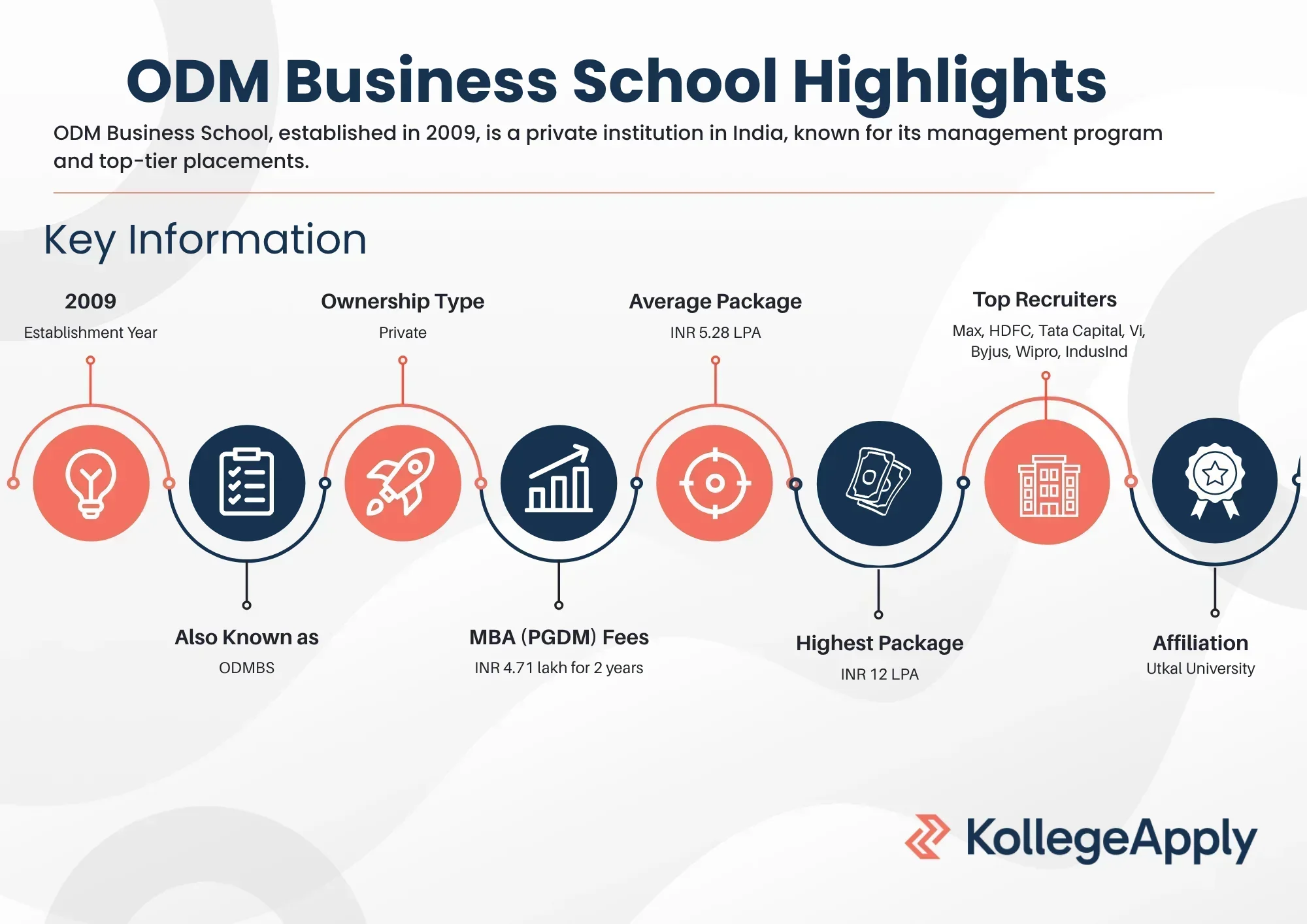 ODM Business School admissions are based on merit and entrance exams. The college accepts scores from any of the national entrance exams, such as CAT, MAT, XAT, GMAT, CMAT, ATMA/OJEE/any other national-level admission test, followed by a Personal Interview. The institution occupies 5 acres of land where students access tech-enhanced classrooms alongside a Wi-Fi-connected campus, a digital library, clean canteen facilities, among others.