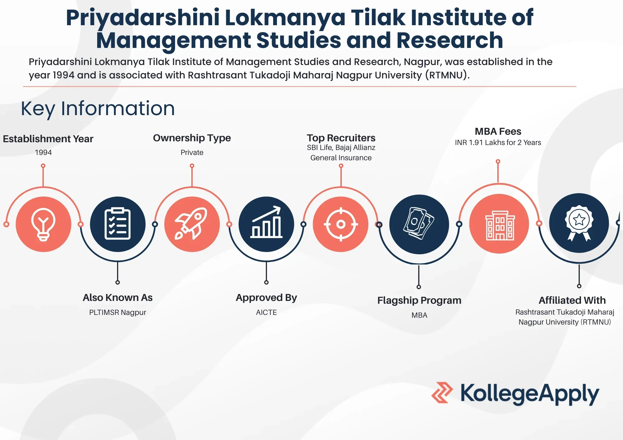 Priyadarshini Lokmanya Tilak Institute of Management Studies and Research, Nagpur, was established in the year 1994 and is associated with Rashtrasant Tukadoji Maharaj Nagpur University (RTMNU). It is approved by the All India Council for Technical Education (AICTE). The institute is dedicated to offering superior management education with a strong emphasis on academic excellence, integrated development, and practical, industry-relevant learning.