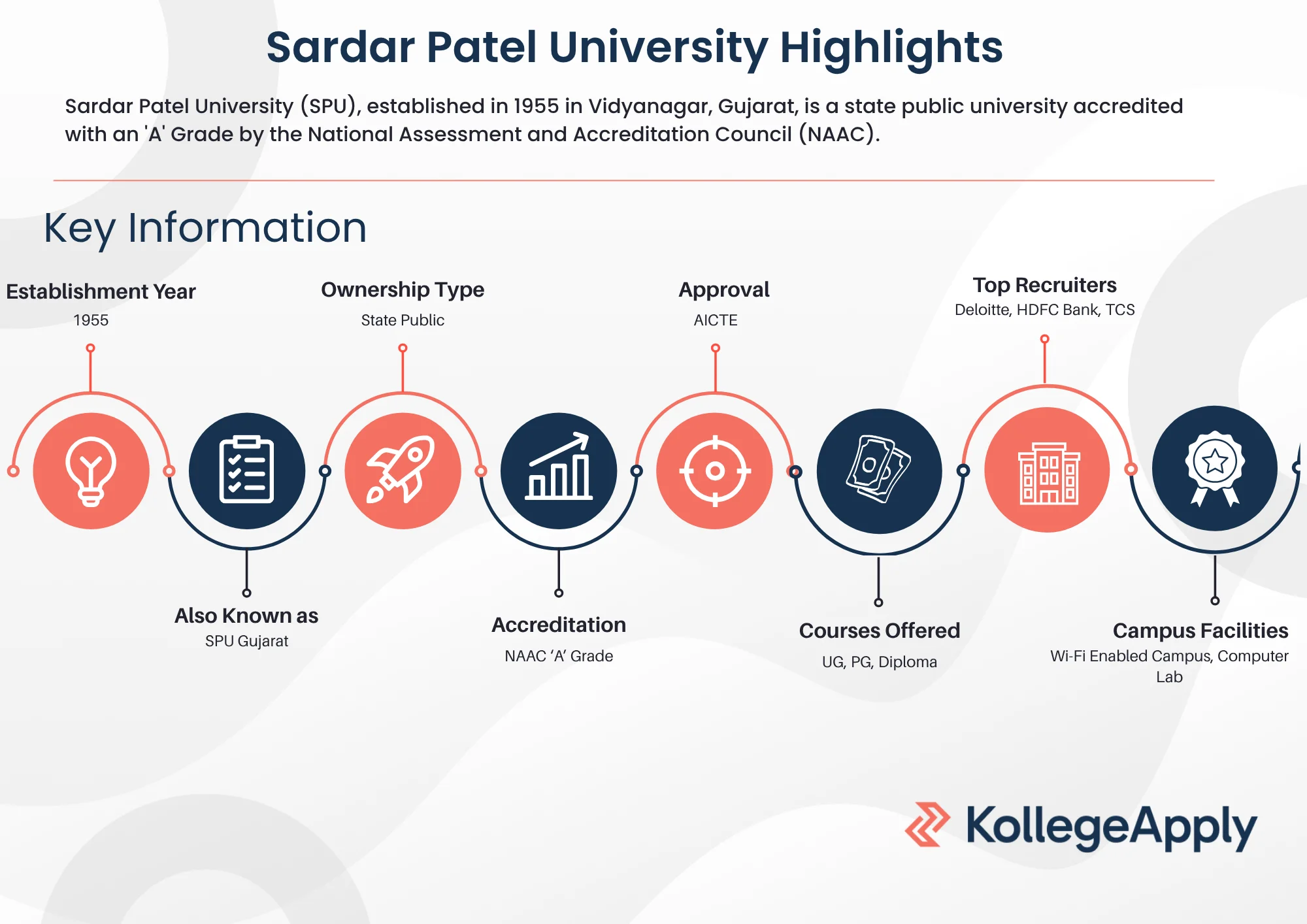 Sardar Patel University (SPU), established in 1955 in Vidyanagar, Gujarat, is a state public university accredited with an 'A' Grade by the National Assessment and Accreditation Council (NAAC). It offers a wide range of undergraduate, postgraduate, diploma, integrated and research programs in arts, commerce, science, business administration, computer applications, performing arts, fashion design, law, and medicine. Integrated and postgraduate programs are also available in disciplines such as biotechnology, management, science, and education.