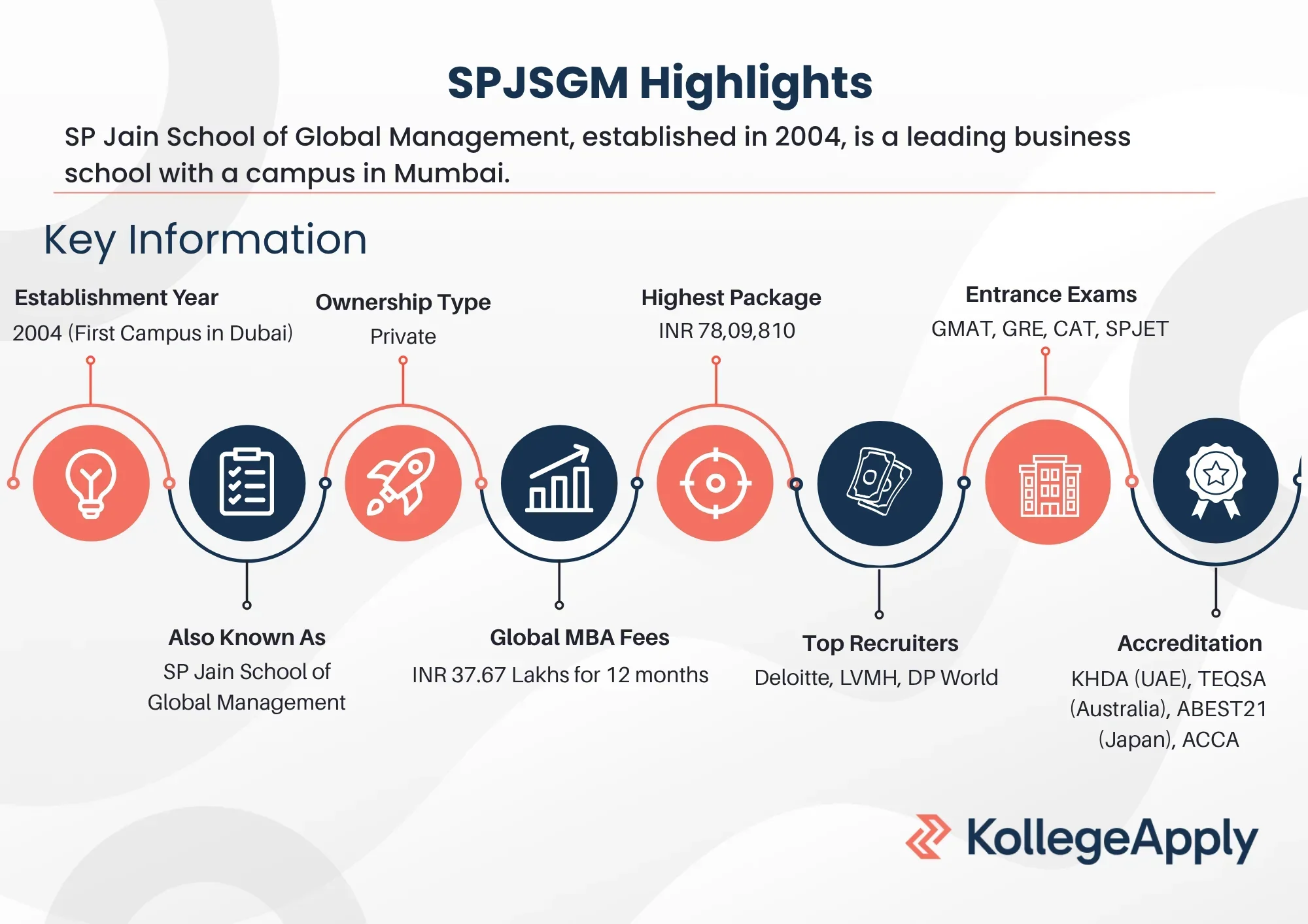 SPJSGM accepts GMAT, GRE, CAT, and its own SP Jain Entrance Test (SPJET) for admissions.