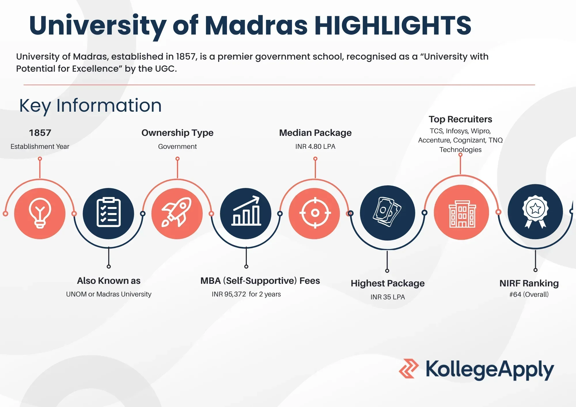 The University of Madras placement report has not been released by the officials yet. University of Madras continues to provide its students with placement support through a centralised placement cell. According to the NIRF 2025 report, the university reported an increase in median salary packages for its postgraduate programs. While official data for undergraduate placements is not released, data for postgraduate programs shows active hiring across research, academic, corporate, and public sector roles.