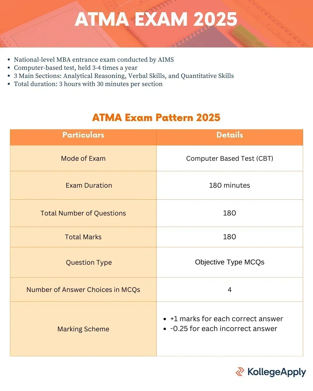 ATMA Exam is a national-level entrance exam for admission to various management programs, such as MBA, PGDM, MCA, and many more. This exam is conducted centre-based online 3-4 times a year. The exam tests the candidates' reasoning, verbal, and quantitative skills. ATMA 2025 Question Paper consists of 180 multiple-choice questions, which are to be answered in a 3-hour duration. One mark is given for each correct answer, and 0.25 marks are deducted for each wrong answer. Continue reading further to know more about the ATMA 2025 Entrance Exam.