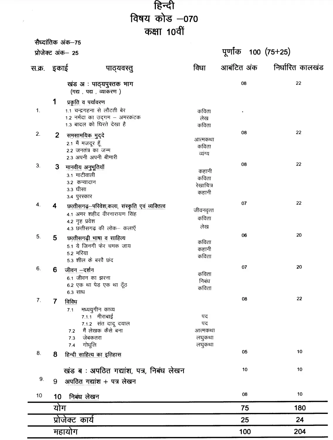 Students appearing for the CGBSE 10th exam next year can find the subject-wise detailed syllabus below: