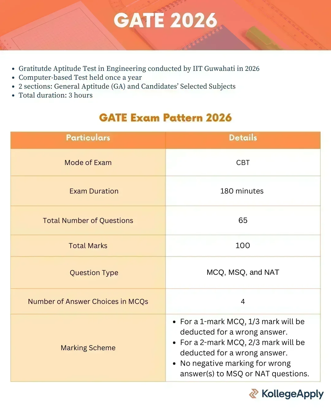 In GATE 2026, questions carry either 1 or 2 marks. There is negative marking only for MCQs 1/3 mark is deducted for a wrong 1-mark question and 2/3 for a 2-mark question. There is no negative marking for NAT or MSQ questions.